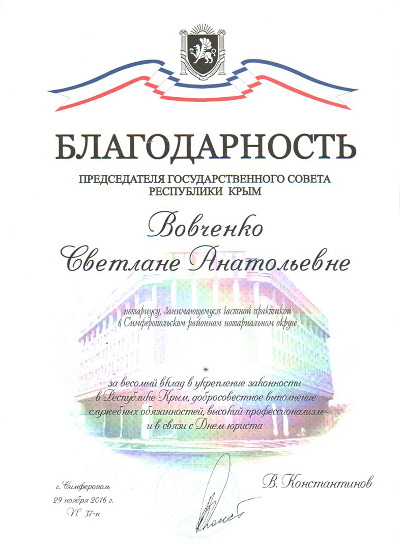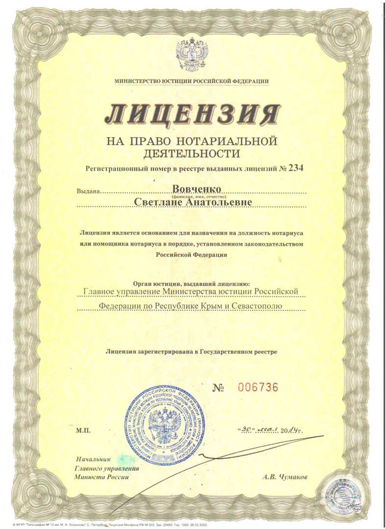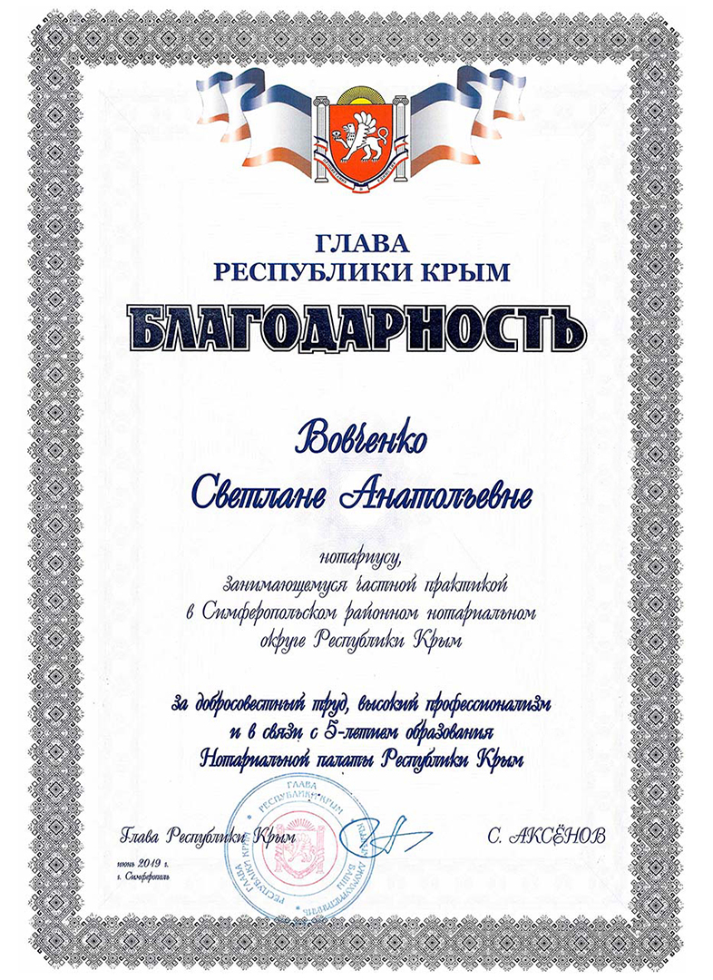 Нотариус Вовченко Светлана Анатольевна совершает весь спектр нотариальных действий, предусмотренных действующим законодательством, в том числе нотариальные действия по удостоверению любых видов сделок, доверенностей, согласий, отказов, заявлений, оформляет наследственные права, обеспечивает меры по охране наследственного имущества, осуществляет выезд, для совершения нотариальных действий вне помещения нотариальной конторы, в пределах Симферопольского района.